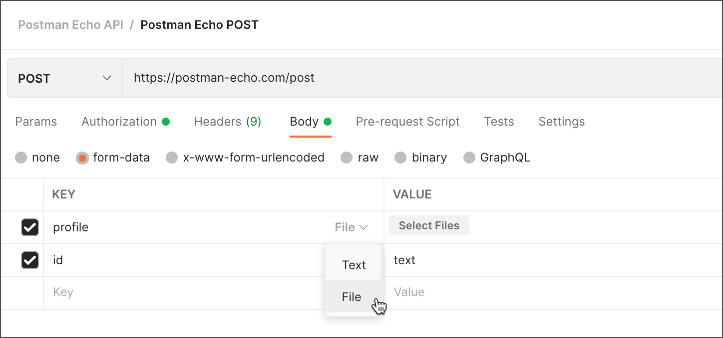 Los formularios de los sitios web a menudo envían datos a las API como archivos multipart/form-data. Puede replicar esto en Postman usando la pestaña form-data Cuerpo. Los datos de formulario le permiten enviar pares clave-valor y especificar el tipo de contenido.