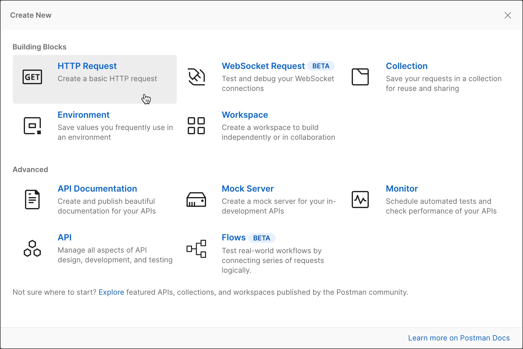 Puede crear una nueva solicitud desde la pantalla de inicio de Postman, usando Nuevo > Solicitud HTTP, o seleccionando + para abrir una nueva pestaña.